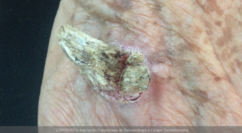 Como una lesión bien definida, como una costra en forma de cono, que parece un verdadero cuerno, generalmente es angosto, tiene de ancho 0,5 a 2cm pero puede tener varios centímetros de largo. Es de crecimiento lento en meses o años. Se presenta más frecuentemente en personas de edad avanzada y en zonas expuestas al sol como cara y manos.