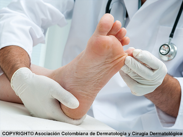La forma más frecuente de presentarse es la aparición de una descamación macerante entre el 4º y 5º espacio  interdigital, acompañado de rasquiña y con tendencia a extenderse hacia las plantas y lados de los pies.