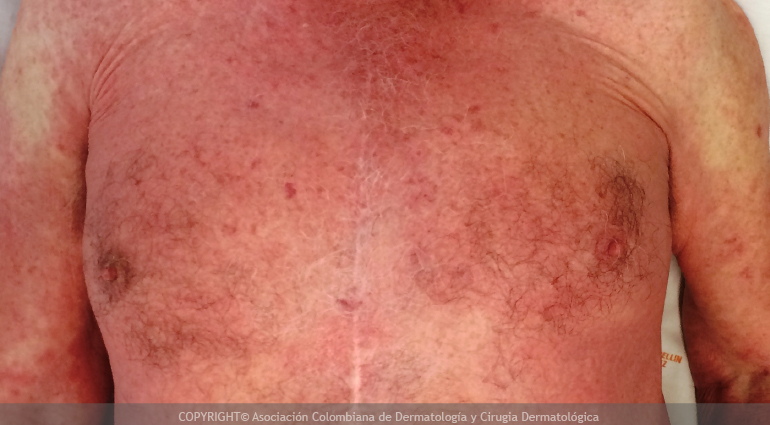 La dermatitis exfoliativa o eritrodermia es una enfermedad inflamatoria de la piel caracterizada por enrojecimiento, descamación y rasquiña que afecta más del 90% de la superficie corporal (casi toda la extensión de la piel del cuerpo). Se describe un predominio de afectación del sexo masculino con una edad promedio de aparición de 60 años.