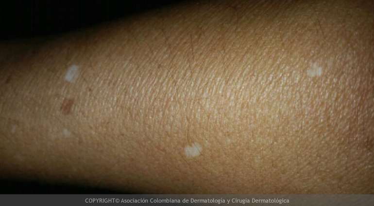 Se caracteriza por la aparición de manchas blancas como porcelana de 2- 5 mm de diámetro, que aumentan en cantidad con la edad. Generalmente aparecen en piel que ha sido expuesta mucho tiempo al sol y se piensa que puede ser parte del foto-envejecimiento de la piel. Los lugares más frecuentes de presentación son los antebrazos y las piernas por debajo de las rodillas.