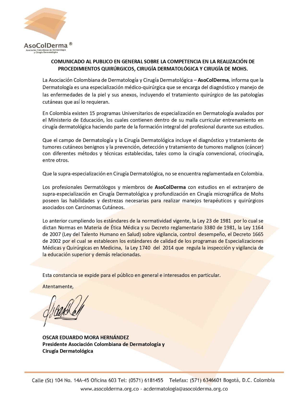 Comunicado de la presidencia de la asociación colombiana de dermatología para conocimiento de la población general frente a la cirugía dermatológica y cirugía de Mohs.