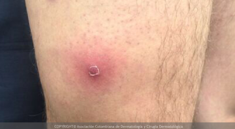 Clínicamente, se observa como un nódulo (masa), generalmente de 0,5 a 1 cm aunque pueden ser mayores, indurado, eritematoso (color rojo), que con el paso de los días aumenta de tamaño y se vuelve doloroso y fluctuante (blando).