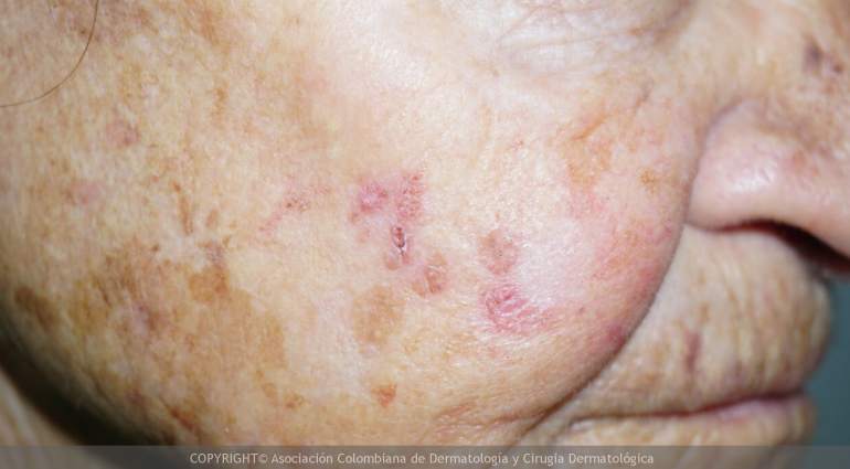 Dan en lugares expuestos al sol como cabeza, cuello, antebrazos y dorso de manos. Más en personas de piel y ojos claros con una prolongada exposición solar a lo largo de sus vidas. Se ve un parche rojo plano de superficie rugosa la cual se palpa mas de lo que se ve. Los tamaños son variables.