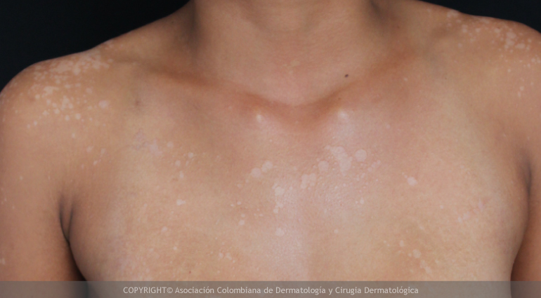 Es una enfermedad más frecuente en adolescentes y adultos jóvenes debido a las características del sebo que ellos producen. Se presenta como manchas claras (más notorias en pacientes de piel oscura), rosadas o parduzcas que típicamente presentan en su superficie una fina descamación  a veces notoria solo en la periferia de la lesión y al estirar la piel afectada. Las lesiones se distribuyen de preferencia en el cuello, tronco superior y tercio superior de los brazos.