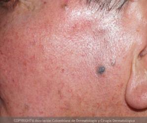 Es un lunar de color azul, gris azuloso o negro azuloso, generalmente único, que mide menos de 10 mm de diámetro. Puede ser plano como una mancha o elevado como un granito.
